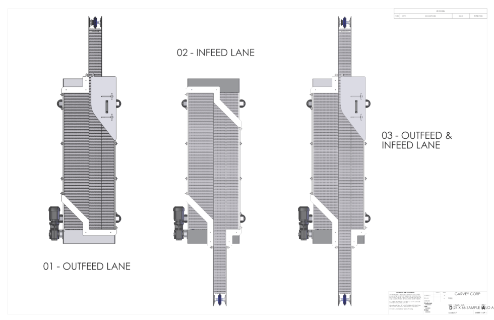 Las mesas de acumulación Bi-Flo de Garvey se pueden diseñar con una amplia variedad de configuraciones y combinaciones de entrada/salida para adaptarse a las necesidades de su producto. La construcción varía desde acero inoxidable o pintado hasta líneas limpias o superficie abierta, entre otras opciones. Las áreas de entrada y salida se pueden diseñar en múltiples configuraciones, lo que convierte a la mesa Bi-Flo de Garvey en la opción ideal para sus necesidades de acumulación.