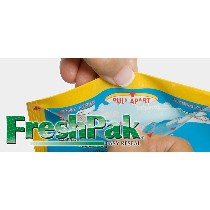 FreshPak™ es fácil de abrir, fácil de resellar y proporciona un sello de garantía. No requiere ranuras de alineación, por lo que FreshPak es fácil de usar para todos, especialmente para niños y ancianos