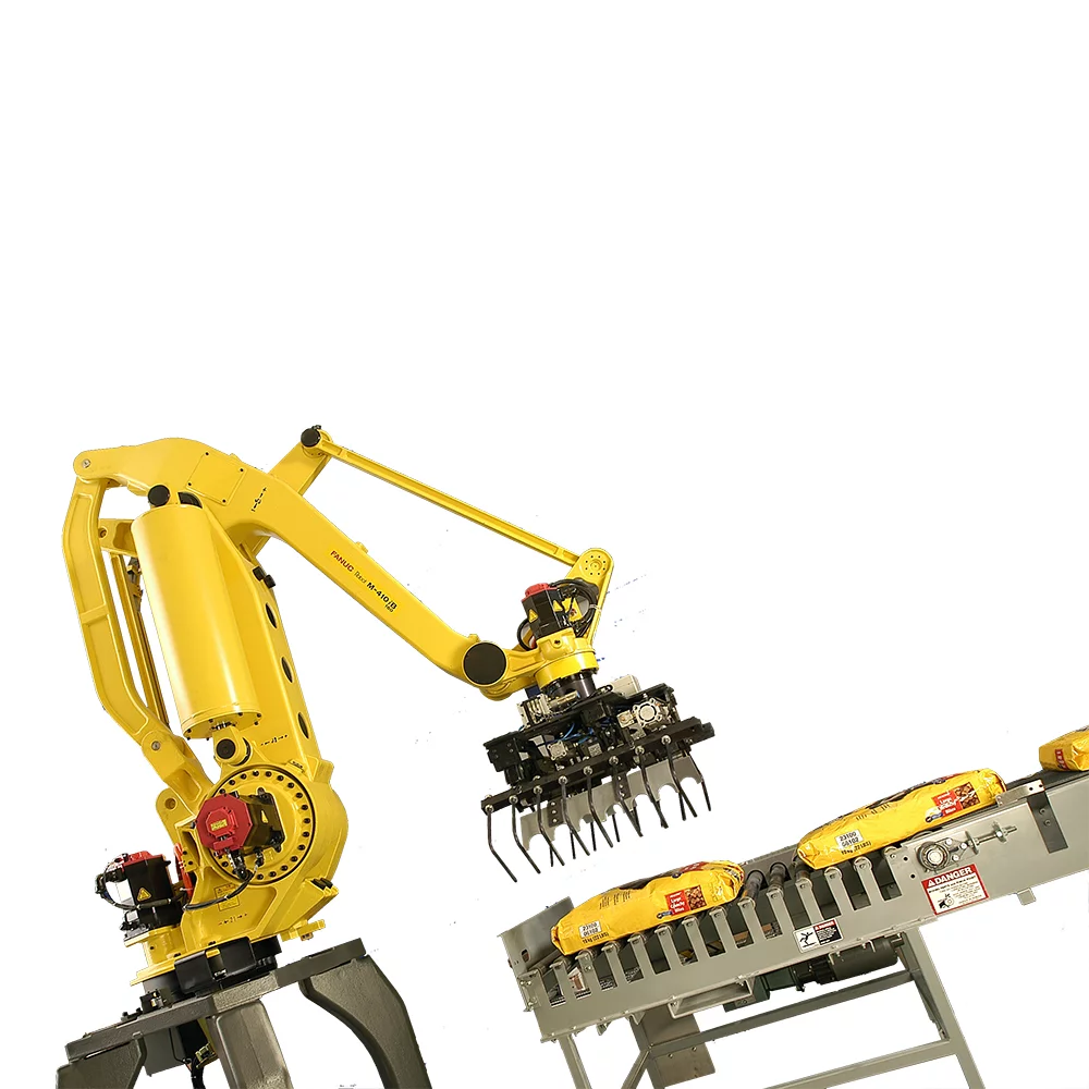 Sistema de paletizado robótico, que permite la manipulación de cajas, fardos y otros productos, con un sistema de garras especialmente diseñado para cada necesidad. El robot Fanuc está fabricado con una estructura de acero al carbono